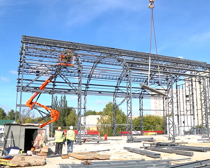 В Костроме полным ходом идёт строительство быстро возводимого модульного бассейна на улице Индустриальной. Металлический каркас будущего спортивного объекта уже обрел отчётливую форму. Когда-то здесь был популярный среди костромичей Давыдовский рынок, а теперь грохочет строительная техника. На территории чуть меньше полутора тысяч квадратных метров скоро появится новый модульный бассейн. Подрядчик уже уложил бетонное основание и стремительно возводит металлический каркас будущей тренировочной базы. Объект готов примерно на 40%. До конца года строители должны полностью завершить работы над основным корпусом спорткомплекса. «После того как будут завершены работы по сборке металлоконструкций работники приступят уже к монтажу стеновых и кровельных панелей. И дальше приступят, когда уже будет завершен, так называемый, тепловой контур здания, зайдут во внутрь и начнут монтировать внутренние инженерные сети и коммуникации», — рассказывает заместитель директора МБУ «Костромастройзаказчик» Ан