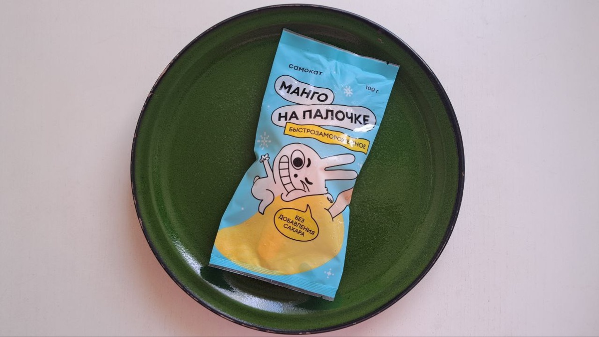 Идея — просто гениальная! Берется очищенная половинка спелого вьетнамского манго, в нее вставляется палочка — и всё это моментально замораживается. Выглядит точно как мороженое, но в составе — только манго (ну и палочка, конечно 😄).