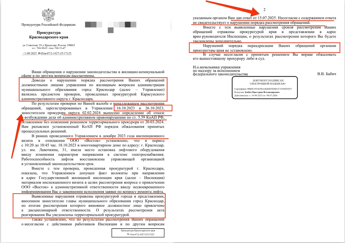 13 сентября 2025 года мною получен ответ от начальника отдела по защите прав граждан прокуратуры Краснодарского края Бабич В.В. от 11.09.2025 № Отв-07/2-1927-25/17125, который является образцом формальной отписки и содержит грубейшие нарушения федерального законодательства.