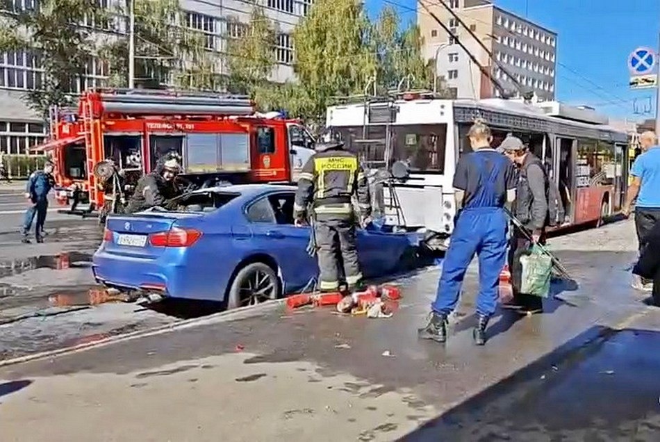 Во Владимире иномарка врезалась в троллейбус Днем 13 сентября во Владимире в районе химзавода произошло ДТП с участием общественного транспорта. Примерно в 13:30 на улице Большой Нижегородской иномарка BMW врезалась в выезжающий с остановки троллейбус. Из-за столкновения у автомобиля загорелся моторный отсек. Пришлось вызывать сотрудников МЧС. Они потушили пожар на площади 2 кв.м и вызволили водителя, который оказался зажат в салоне. У троллейбуса же пострадала только задняя часть. Подписаться | Предложить новость