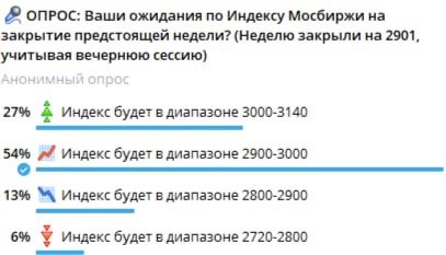 🎤 На прошлой неделе было 6 важных опросов! Проверим, кто оказался Вангой: 1️⃣ Опрос про ожидания по Индексу Мосбиржи! Неделю закрыли на уровне 2834, сделав за неделю -67 пунктов! и все они пришлись на пятницу. Всего 13% - ВАНГИ! 54% ожидали рынок выше 2900 пунктов! 27% ждали рынок выше 3000! 2️⃣Опрос по паре юань-рубль! Юань-рубль закрылся на уровне 11,75! 29% Ванги! 50% ожидали, что юань продолжит оставаться в боковике 10.84-11,64. 3️⃣Опрос по инфляции! Инфляция была 0,10%, рынок на вечерке закрылся там же, где он был до оглашениях этих данных, то есть реакция нейтральная. Суммарно инфляцию выше -0,08 ждали 54%. А 46% ждали еще более мощной дефляции. 4️⃣ Опрос про Польшу! 75% - Ванги, которые сказали, что ничего не будет. 5️⃣ Опрос про вторую фазу санкций от Трампа! В понедельник никакого кошмаринга не случилось, то есть 33% - Ванги. В итоге, только в пятницу это было озвучено во время пресс-конференции ЦБ, что придало рынку ускорение в падении. Но вторая фаза санкций будет толь