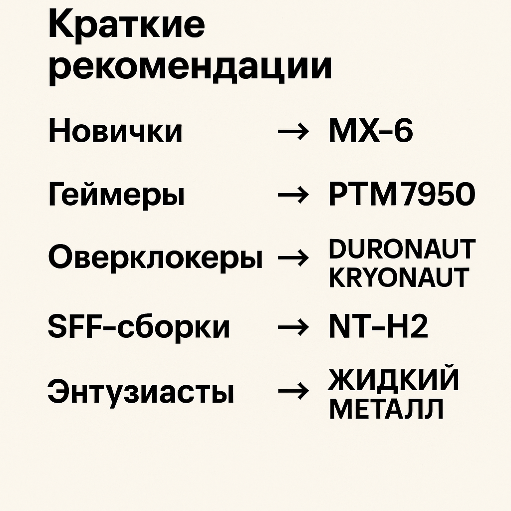 Если вы собираете новый ПК, апгрейдите старый или хотите выжать максимум из железа, то термопаста — та самая «мелочь», которая решает всё. От неё зависит температура процессора, стабильность видеокарты и даже срок жизни вашего компьютера. В 2025 году рынок термопаст сильно изменился: появились новые составы с фазоизменяющимися материалами, графеновыми добавками и долговечностью до 10 лет. А значит, пора разобраться, какую пасту выбрать в 2025–2026 годах и чем они отличаются. 🚀 Термопаста (Thermal Interface Material, TIM) наносится между чипом (CPU, GPU) и кулером, заполняя микроскопические зазоры. Без неё температура компонентов была бы на 20–50% выше, а это троттлинг, зависания и даже смерть железа. Особенно актуально это в 2025 году, когда: ❌ Ошибки: слишком много (воздушные пузыри), слишком мало (плохой контакт), пальцами размазывать нельзя. Термопаста — это не просто расходник, а страховка стабильности и производительности вашего ПК. Инвестиция в хорошую паст