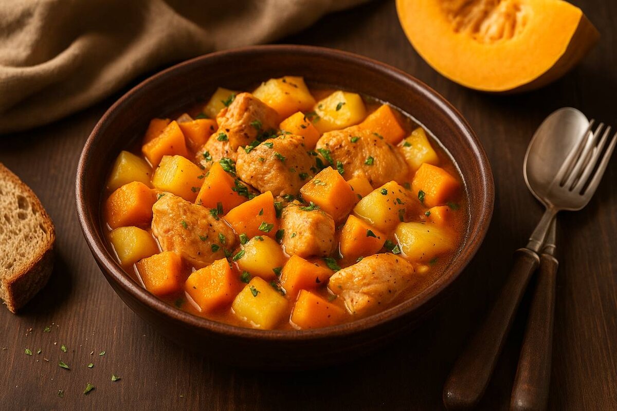 Тыква даёт естественную сладость и бархатистую текстуру соуса, а курица белок и насыщенность. Картофель делает рагу сытным, а специи собирают всё в цельную композицию. Баланс простой: сладость тыквы + сливочная мягкость + лёгкая пряность. Итог — яркое блюдо, которое одинаково любят и дети, и взрослые.