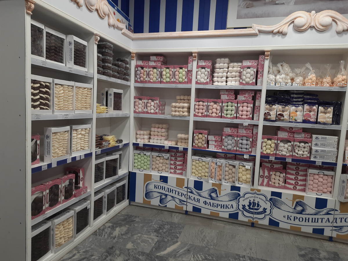 На вокзале мы сначала зашли в отдел с продукцией Кронштадтской кондитерской фабрики. Мне в комментариях советовали купить тут зефир.