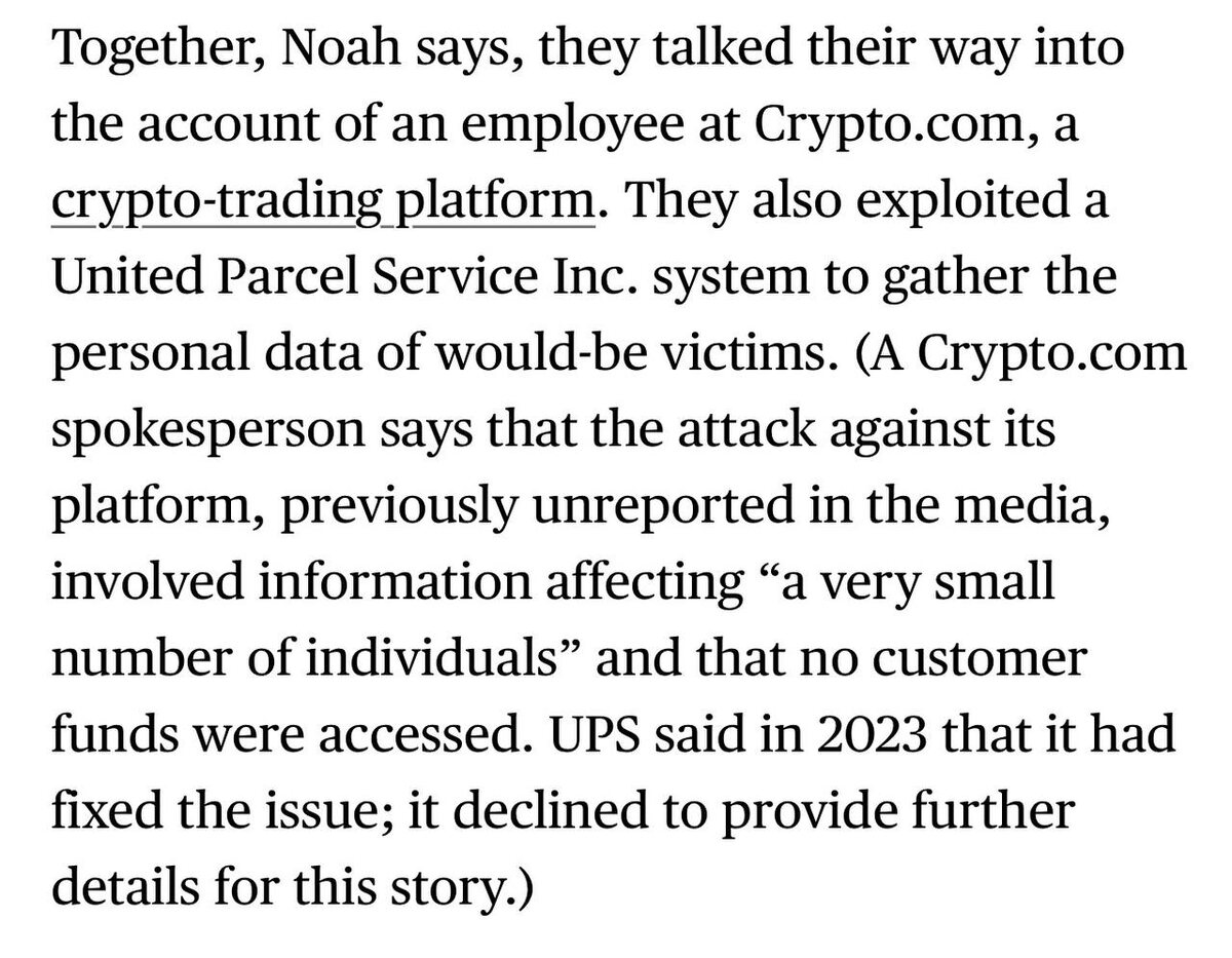 🏴☠️ В новой статье Bloomberg о Scattered Spider сообщается, что централизованная биржа Crypto[.]com ранее подверглась взлому и никогда