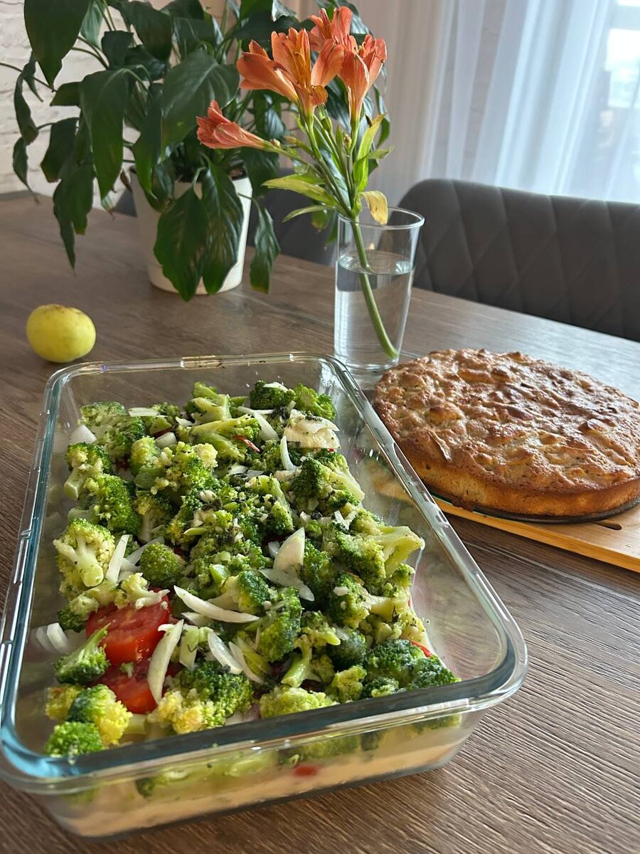 (Треска, лук, помидоры, брокколи, залито взбитым яйцом с молоком)
