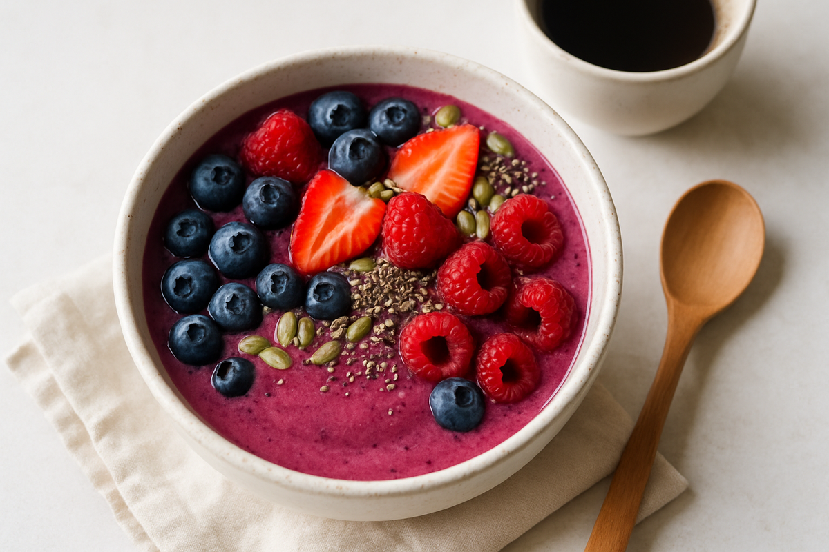 Нет времени на завтрак, а день требует энергии? 🏃♀️ Попробуйте наш смузи-бол с овсянкой и ягодами — готовится за 10 минут, насыщает на 4 часа и заряжает бодростью для продуктивного дня! Смузи-бол сочетает в себе все необходимое для энергичного утра: клетчатку из овсянки, белок из йогурта и витамины из фруктов. Такой завтрак запускает метаболизм и дает стабильную энергию без резких скачков сахара. 💡 Факт: Исследования показывают, что полноценный завтрак улучшает концентрацию внимания на 20% и повышает продуктивность в течение дня. Идеально для занятых мам! 🌾 Основа смузи: 🍯 Для вкуса и пользы: 🔧 Оборудование: блендер, миска, ложка Залейте овсяные хлопья молоком и оставьте на 2 минуты для набухания. Это сделает смузи более кремовым. В блендер добавьте набухшие хлопья, йогурт, банан и мед. Взбейте до однородной кремовой консистенции. Смузи должен быть густым, как мороженое. Если жидковато — добавьте еще хлопьев, если густовато — немного молока. Перелейте в миску, посыпьте семенами л