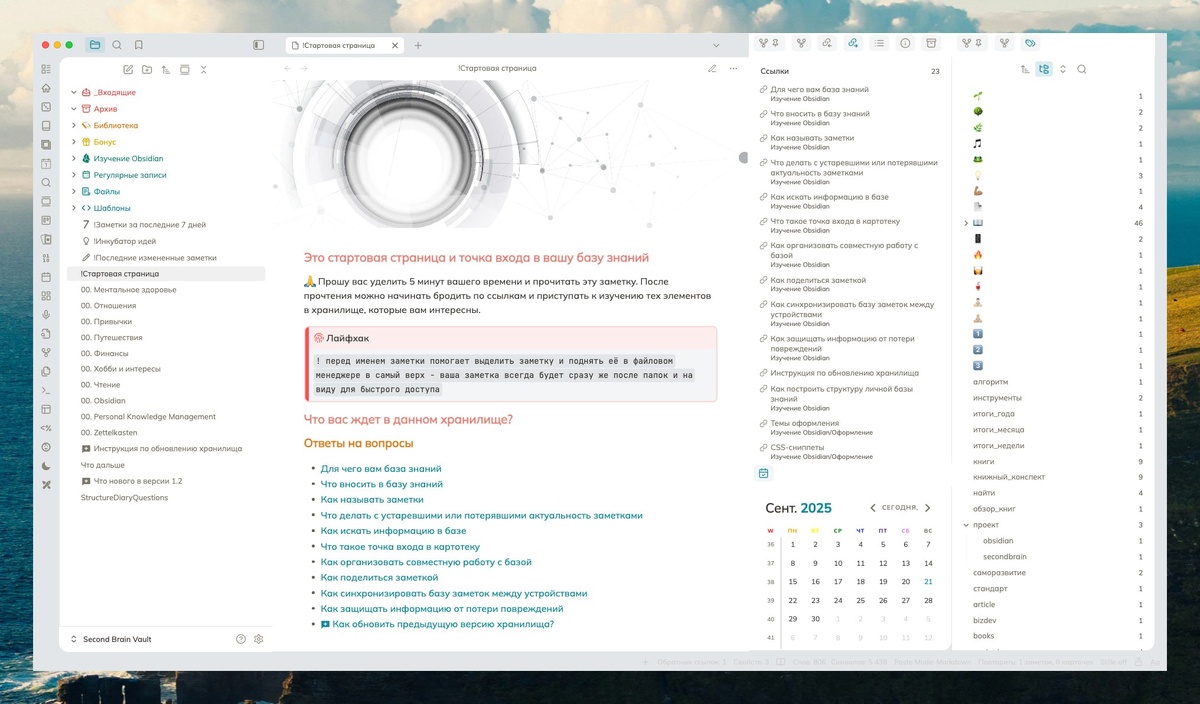 👷 Делаем двойную правую панель В одном из прошлых постов про новую тему поделился скрином своего основного хранилища, и особо глазастые пользователи задали логичный вопрос - а как это получилось сделать сдвоенную по горизонтали панель с правой стороны? Делюсь секретом (и рабочим решением)... Но сначала отвечу на вопрос - зачем это вообще нужно? Если у вас много плагинов, имеющих возможность вывода служебной информации на боковые панели, и вы хотите получить доступ к этим данным максимально быстро - вы пришли по адресу. Я у себя таким образом разделил правую панель на 2 части: в одной части у меня информация со встроенных плагинов (локальный граф, входящие/исходящие ссылки, свойства, теги, история синхронизации), во второй - Copilot, Smart Connections, Toggl Track и т.д.). Разделив правую панель на 2 части, я решал простую задачу - снизить скорость открытия нужных мне плагинов. Чтобы не ходить через Cmd+P, не вспоминать сочетания клавиш (их у меня уже реально много стало, все не уп