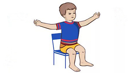 И. п.— руки согнуты в локтях и прижаты к туловищу ладонями вниз. Пальцы как будто удерживают мячик, яблоко. Поочередно приводя через стороны по круговой амплитуде кисти рук к себе (до уровня надбровных дуг), выполнить движение «медвежонок умывает мордочку». Темп свободный. Вдох сменяется выдохом синхронно со сменой рук.