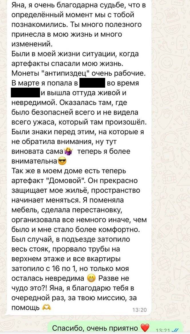 В марте 2024 она оказалась на концерте во время печально известных событий. С ней была монета "Антиpizdeц" — и в итоге она: • Оказалась в наиболее безопасной зоне • Не видела происходящего ужаса • Вышла невредимой После покупки монет «Антиpizdeц» она купила Артефакт "Домовой". Результаты ощутила сразу же: • Когда затопило весь подъезд (с 16 по 1 этаж!), её жильё осталось сухим. • После покупки Артефакта Домовой: ✓ Сама переставила мебель ✓ Создала новое комфортное пространство ✓ Ощутила изменения в атмосфере дома Изготовление Артефактов – один из моих самых сильных скилов. Обожаю их создавать, а отзывы о качестве моей работы говорят сами за себя. Мой telegram-канал https://t.me/vedma_sila_sudba