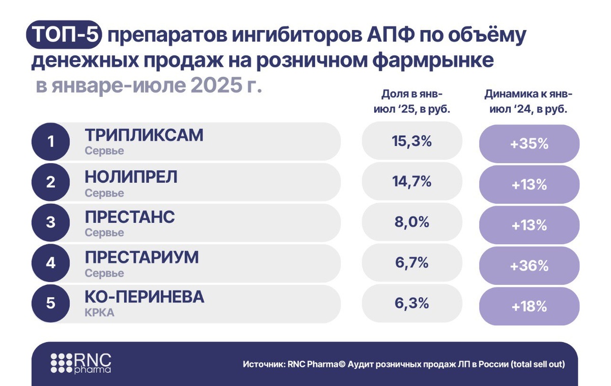 πΒ Π ΠΎΡΡΠΈΡΠ½Π΅ ΠΏΡΠ΅Π΄ΠΏΠΎΡΠΈΡΠ°ΡΡ Π»Π΅ΡΠΈΡΡ Π°ΡΡΠ΅ΡΠΈΠ°Π»ΡΠ½ΡΡ Π³ΠΈΠΏΠ΅ΡΡΠ΅Π½Π·ΠΈΡ ΠΊΠΎΠΌΠ±ΠΈΠ½ΠΈΡΠΎΠ²Π°Π½Π½ΡΠΌΠΈ ΠΏΡΠ΅ΠΏΠ°ΡΠ°ΡΠ°ΠΌΠΈ ΠΠΎ Π΄Π°Π½Π½ΡΠΌ RNC Pharma Π² ΡΠ½Π²Π°ΡΠ΅-ΠΈΡΠ»Π΅ 2025 Π³.: πΒ 26,4 ΠΌΠ»ΡΠ΄ ΡΡΠ±Π»Π΅ΠΉΒ ΡΠΎΡΡΠ°Π²ΠΈΠ» ΠΎΠ±ΡΡΠΌ ΠΏΡΠΎΠ΄Π°ΠΆ ΠΈΠ½Π³ΠΈΠ±ΠΈΡΠΎΡΠΎΠ² ΠΠΠ€ (C09A ΠΈ C09B ΠΏΠΎ EphMRA) Π½Π° ΡΠΎΡΡΠΈΠΉΡΠΊΠΎΠΌ ΡΠΎΠ·Π½ΠΈΡΠ½ΠΎΠΌ ΡΡΠ½ΠΊΠ΅, Π²ΠΊΠ»ΡΡΠ°Ρ ΠΎΠ½Π»Π°ΠΉΠ½ ΠΊΠ°Π½Π°Π» (+16,8% ΠΊ ΡΠ½Π²-ΠΈΡΠ» β24) πΒ 75,5 ΠΌΠ»Π½ ΡΠΏΠ°ΠΊΠΎΠ²ΠΎΠΊ ΠΏΡΠ΅ΠΏΠ°ΡΠ°ΡΠΎΠ² Π±ΡΠ»ΠΎ ΡΠ΅Π°Π»ΠΈΠ·ΠΎΠ²Π°Π½ΠΎ (+0,8% ΠΊ ΡΠ½Π²-ΠΈΡΠ» β24) πΒ 76 Π±ΡΠ΅Π½Π΄ΠΎΠ²Β ΠΈ Π±ΠΎΠ»Π΅Π΅ 590 SKUΒ ΠΎΡ 60 ΠΊΠΎΠΌΠΏΠ°Π½ΠΈΠΉΒ ΠΏΡΠ΅Π΄ΡΡΠ°Π²Π»Π΅Π½ΠΎ Π½Π° ΡΡΠ½ΠΊΠ΅ πΒ 74,7% Π² ΡΠΏΠ°ΠΊΠΎΠ²ΠΊΠ°Ρ