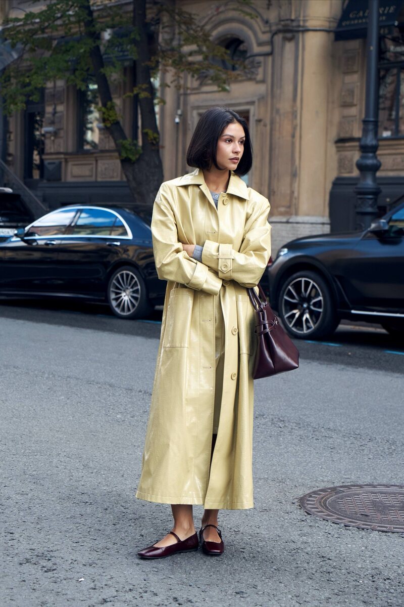 Образ для теплой осени от стилиста Kristina&Milan 🍂 Лакированный плащ и юбка миди лимонного оттенка с анималистичной фактурой поддерживают актуальный тренд на глянцевую лакированную кожу (как у Bottega Veneta и Saint Laurent) и приглушённые, но сложные оттенки. Сочетание с серым меланжевым кардиганом создаёт баланс: он смягчает блеск лакированной кожи, делая образ более повседневным. Балетки Мери Джейн в насыщенном винном оттенке с деликатной анималистичной фактурой объединяют жёлтый и серый, а перекликание фактур с верхом завершает образ и делает его цельным. Как вам сочетание этих оттенков и фактур: смело или повседневно ?👇🏼