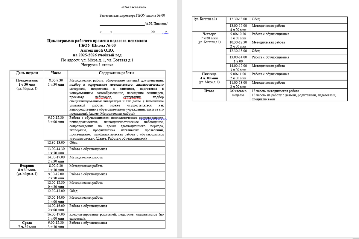 Согласно Приказу (Приказ Минпросвещения РФ№ 268 от 04 апреля 2025 г., который с 1 сентября 2025 года регламентирует особенности режима труда педагогических работников в ОО), продолжительность рабочей недели педагога-психолога — 36 часов за ставку заработной платы. Из них: не менее 18 часов в неделю выделяется на работу с детьми, родителями, педагогами, специалистами (практическая работа). Отдельной строкой рекомендуется указать работу с родителями и педагогическими работниками. Эта работа считается практической. Оставшееся время, 18 часов — на методическую работу. Можно прописать 1 час – консультирование педагогов и специалистов, 1 час – консультирование родителей и включить это время в 18 часов. А также допустимо добавить это время к практической части работы и тогда распределение времени будет таким: практическое время 20 часов, методическое время – 16 часов.