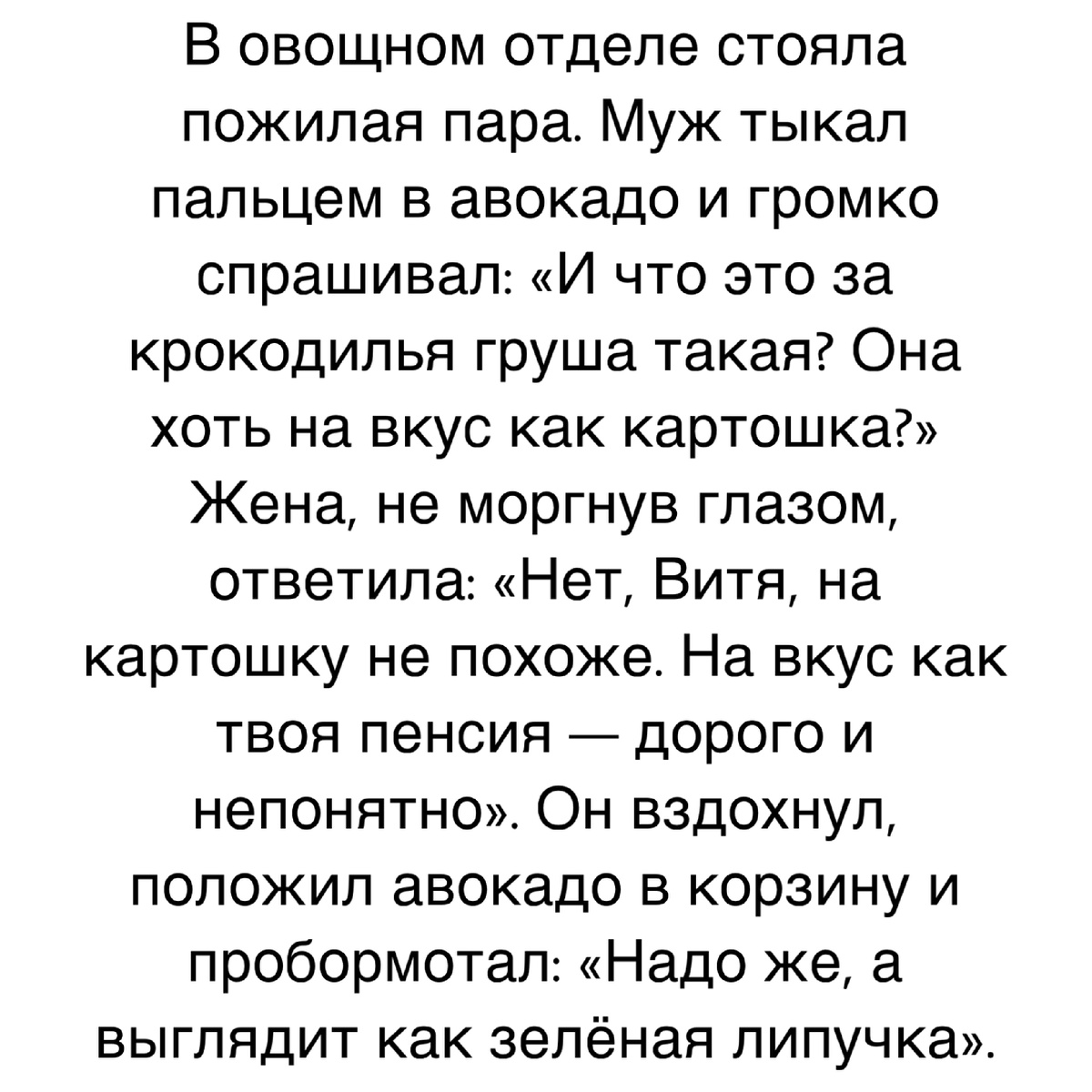 В овощном отделе стояла пожилая пара. Муж тыкал пальцем в авокадо и громко спрашивал: «И что это за крокодилья груша такая? Она хоть на вкус как картошка?» Жена, не моргнув глазом, ответила: «Нет, Витя, на картошку не похоже. На вкус как твоя пенсия — дорого и непонятно». Он вздохнул, положил авокадо в корзину и пробормотал: «Надо же, а выглядит как зелёная липучка».