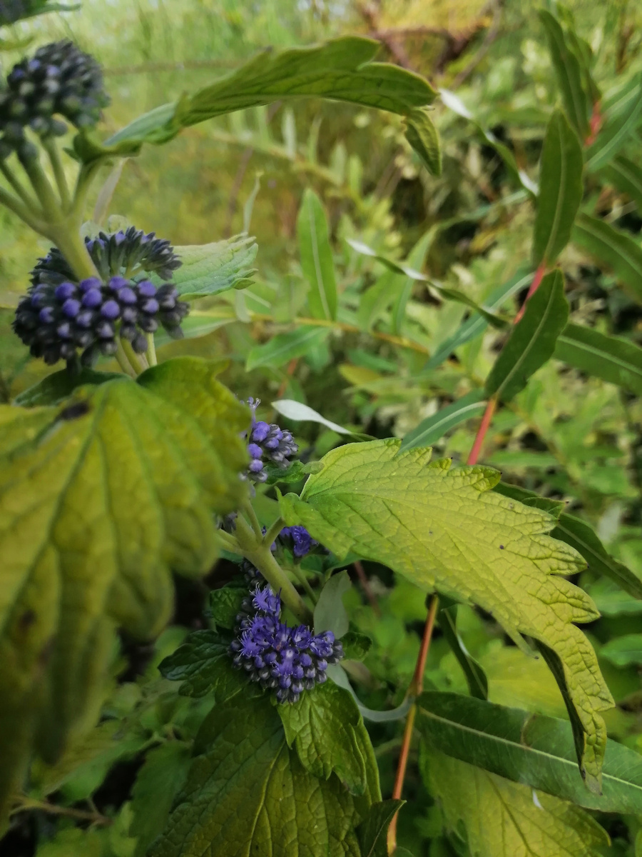 Это я про кариоптерис. Поскольку заморозков у нас еще не было и, более того, в ближайшую неделю не ожидается, то ему свезло. Можно сказать, он расцвел. Почти. Не будем придираться. Опять же, я делаю скидку на то, что он у меня появился только нынче и был небольшим черенком. Спасибо что вообще дошел до цветения. Поскольку сорт желотолистный - 'Hint Of Gold' - то листья, соответственно, должны быть желтые. Они таки да. Не очень яркие, но все же желтый оттенок виден довольно отчетливо. Зимовать будет под укрытием, а вот ежели перезимует, то я планирую его начеренковать. Потому что растение все лето не требовало к себе внимания - рос и рос. Ни болячек, ни вредителей. В теории у кариоптериса пятая зона, так что все возможно. С другой стороны, у львиной доли роз она тоже пятая, а то и шестая. Зимуют же, пусть и под укрытием... Еще из интересного - странный цвет выдала нынче гортензия 'Polestar'. Такое ощущение, что она прикидывается дуболистной какой-нибудь. На больную вроде не похожа, н