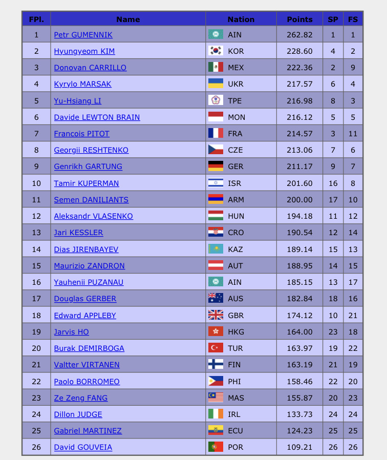 В Пекине подошел к концу квалификационный турнир на Олимпиаду 2026 в Милане. И если за Аделию Петросян было особенно волнительно. Она хоть и уровнем выше всех соперниц, но соревновалась без ультра-си и было не ясно, как ее оценят: какие будут надбавки и компоненты. Это всегда очень субъективно и может существенно повлиять на итоговое положение мест. То у Петра Гуменника ситуация была чуть лучше. Состав участников у мужчин был гораздо скромнее, единицы заходили на элементы ультра-си. В результате мы имеем уверенную победу Петра с отрывов в 34 балла. Не могу сказать, что кто-то из фигуристов, кроме Петра, зацепил. Мне по энергетике понравился спортсмен из Монако Давид Льютон Брейн, который был только с тройными прыжками и без тройного акселя. Но ему не хватило совсем чуть-чуть для того, чтобы завоевать квоту на Олимпийские игры. Более того, он проиграл не слабым контентом, а последним вращением. Неплохой фигурист Хёнгём Ким из Южной Кореи, завоевавший серебро. У мексиканца Донована Карр