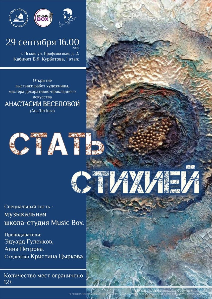 В Псковской областной библиотеке готовятся ко Дню рождения Валентина Курбатова. 29 сентября там пройдет сразу несколько мероприятий. В 16:00 в кабинете Курбатова областной библиотеки состоится открытие выставки работ псковской художницы Анастасии Веселовой "Стать стихией". В экспозиции будут представлены работы, исследующие взаимосвязь текстуры, цвета и формы. Художница вдохновляется природой и идеей мимолетности, создавая многослойные произведения, отражающие циклы жизни. Участники открытия выставки познакомятся и с результатами работы добровольцев общественного проекта "Цитаты из Курбатова" - они посвящены художникам, художественному поиску, творчеству, природе. Музыкальный подарок: выступление преподавателей и студентки музыкальной школы-студии Music Box. Вход свободный, количество мест ограничено. Фото: Псковская областная библиотека