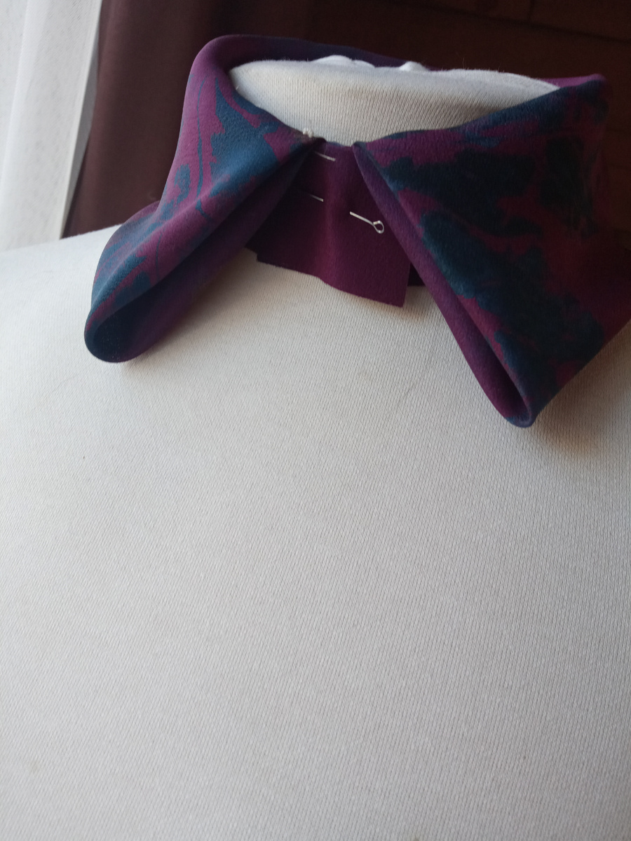 Ну, лепота же получается! По другому я не могу сказать! То что ожидала, то и получается: И это пока всё только в черновом виде. Я прям кайфую: от цвета, от этого воротника, от всей идеи! И кстати, на этом фото прям очень похоже на тот цвет, что в действительности. Очень красивый и блуза у меня будет просто огонь. Пока всё вымеряю, думаю где и что подкорректировать: На самой основе делаю супатную застёжку , чтобы пуговицы не отвлекали от деталей, а их у меня в этой блузе будет несколько. Кроила воротник по косой и в разборе похожей модели меня спросили почему именно так надо кроить? Всё очень просто: деталь воротника это прямоугольник и если его раскроить просто по прямой, то он не сядет вот так красиво и будет топорщится: Очень классно прилегает, как раз за счёт того, что крой идёт по косой. Решила чуть уменьшить ширину детали воротника. Смотрела, как именно на мне ложится и буквально 0.5 см лишние. Вроде бы мелочь, но достаточно важная. И если с воротником всё уже пон
