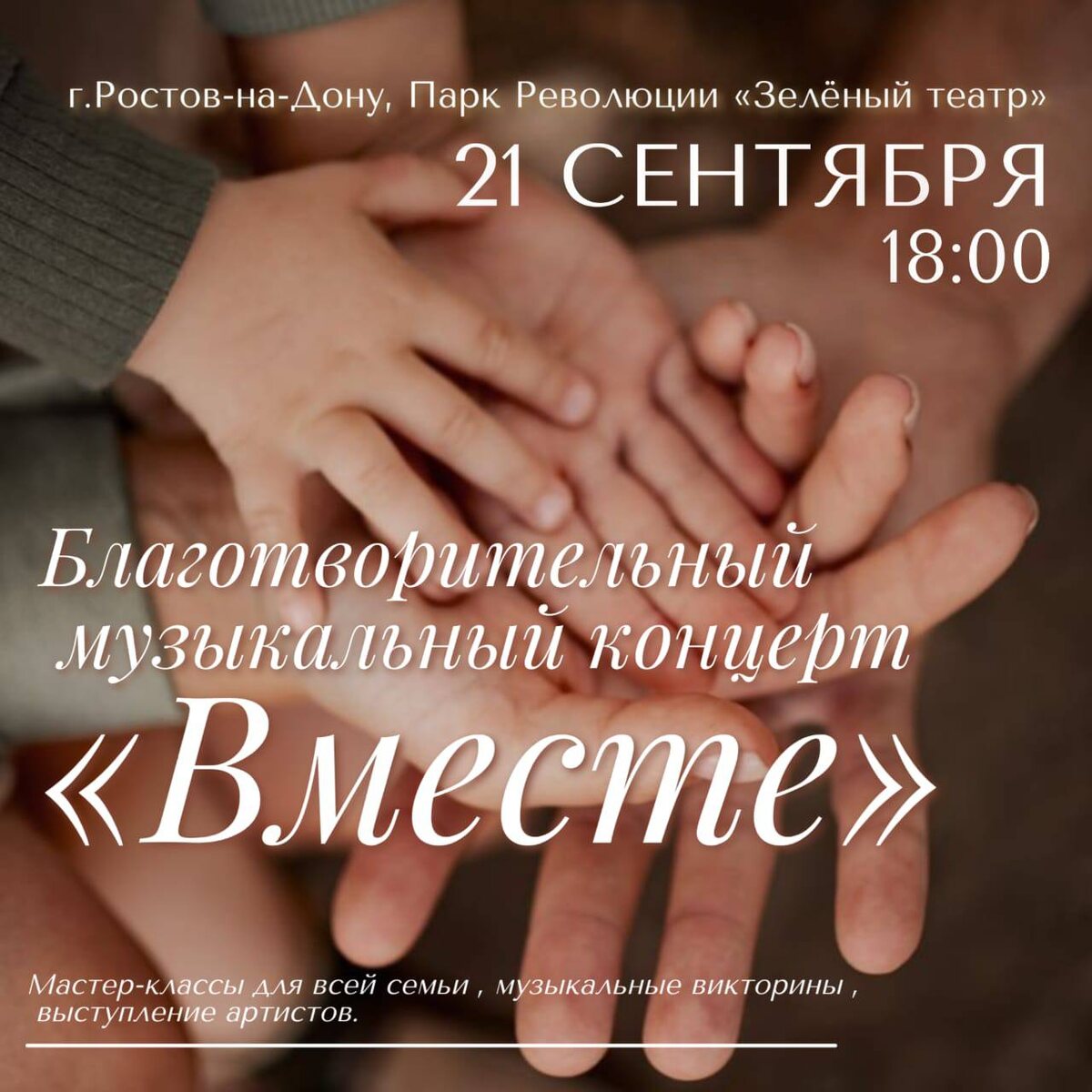 21 сентября в 18:00 в Зелёном пройдет Благотворительный Музыкальный концерт «Вместе» Насладитесь исполнением музыкальных, хореографических коллективов нашего города! Программа мероприятия: 🕒 15:00 - интерактивная развлечения для всей семьи, викторины и розыгрыш подарков 🎼 18:00 - музыкальный концерт Все собранные средства от продажи билетов пойдут на строительство Храма святого великомученика и целителя Пантелеимона (х.Калинин) Приобрести билеты вы можете по ссылке: https://cbiletom.ru/event.php?event=6389&ysclid=mfao7gy7od310614379 Детям до 12 лет вход свободный! Зеленый театр пл. Театральная, 3 🫠 Детские мероприятия Ростов-на-Дону. Я местный!