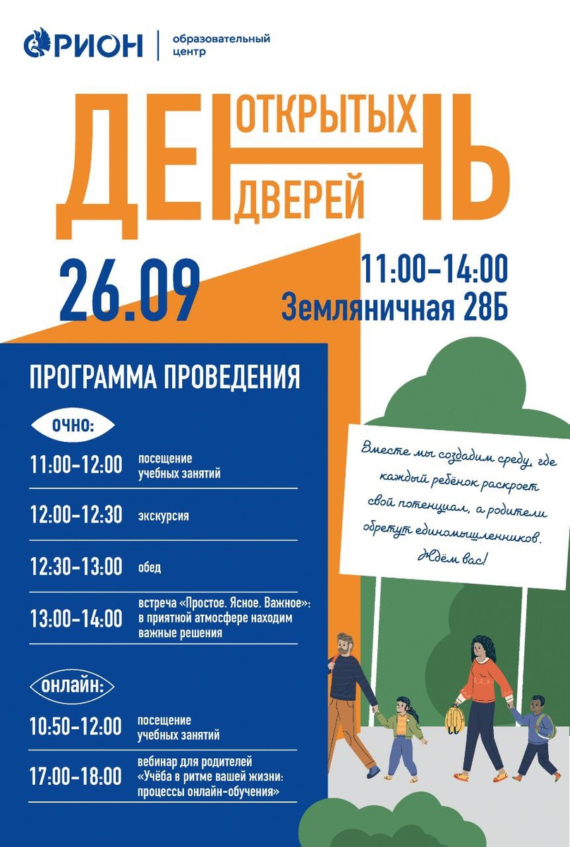 Дорогие друзья! Приглашаем на День открытых дверей в «Орион» 💙 Приходите познакомиться с атмосферой Центра и нашими преподавателями 🫶 Программа → на афише Ждём всех! 🗓 26 сентября 📍 ул. Земляничная, д. 28Б