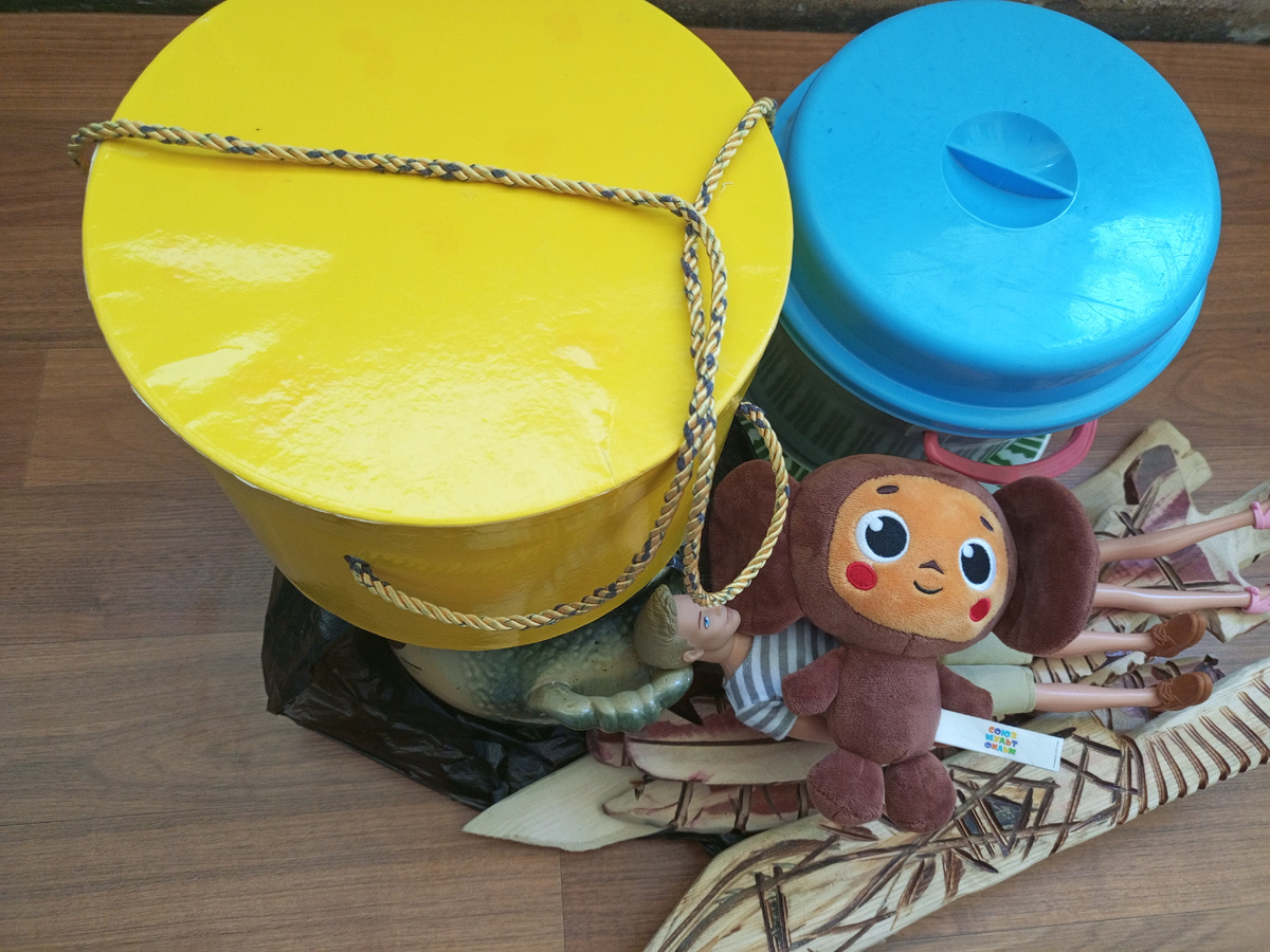 Здравствуйте, друзья! Заканчивается еще одна сентябрьская неделя. Ах, время, времечко летит, не остановишь. Возвращаюсь я в город на побывку к мужу после своих огородно-садовых забот, и что я вижу? На лоджии вот это. 😵 Муж натаскал, заботится, чтобы не засох мой творческий росток. 😂 Да и у него самого есть такая чуйка, видит то, мимо чего я пройду. Однажды в баночке с выброшенной мелочёвкой, типа старых пуговиц, нашел вот это. Смотрю и думаю: чего только не покупалось на эту монетку, какие люди держали ее в руках, целые картины вырисовываются перед глазами. Базары, ярмарки с калачами и гусями. Или какая-нибудь мамзель бусики себе покупала. И что вообще можно было тогда купить на эту денежку? Очень интересно! Даа уж. Ну, вернемся к нашим находкам. Не серебро, не злато, но все же. 😅Сначала разберемся с игрушками . К слову сказать у меня семеро внуков , так что игрушки нужны . Вот такая семейная парочка и новый Чебурашка . Мадам оказалась в интересном положении . 🤔Ну и игрушечки нын
