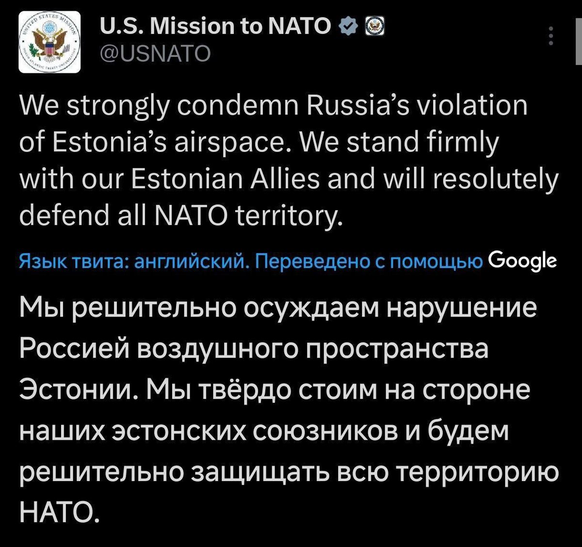 Миссия США при НАТО обвинила Россию в нарушении воздушного пространства Эстонии
