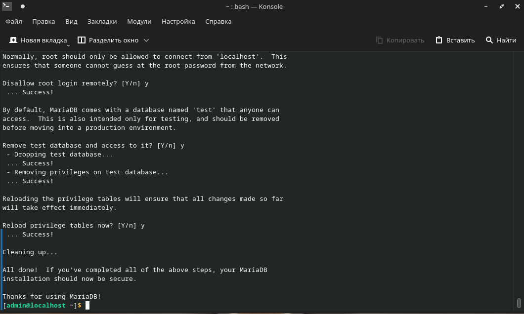После успешного подключения вы окажетесь в интерактивной консоли MariaDB: