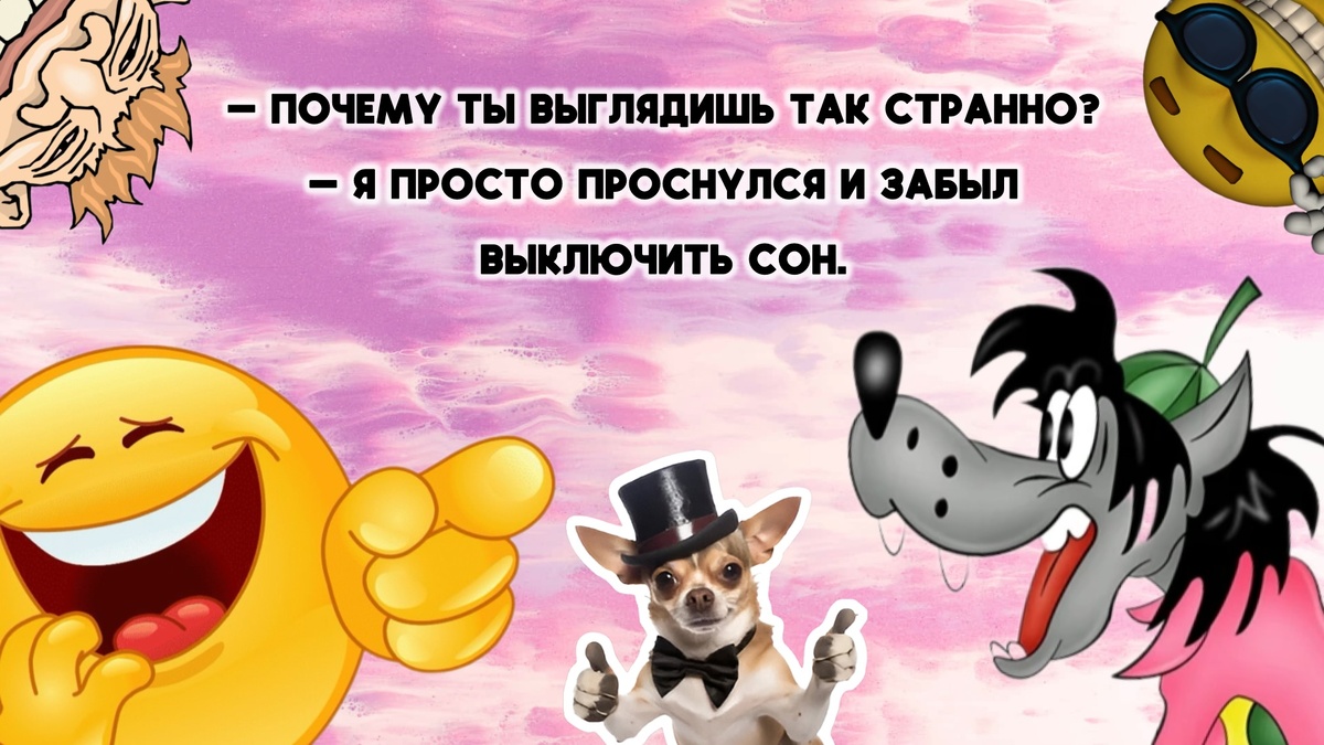 1 — Доктор, я кажется, растение. — Почему вы так решили? — Меня тянет к солнцу, я молчу, когда на меня кричат, и я поливаю себя чаем по утрам. 2 — Почему вы купили такую маленькую машину? — Чтобы было легче найти на парковке. — И как? — До сих пор ищу. Уже неделю. 3 Объявление: "Пропал кот. Особые приметы: считает себя главным в доме. Ну, вы поняли." 4 — Я вчера видел, как ваш холодильник разговаривал с микроволновкой! — И о чем они? — Холодильник жаловался, что вы едите его содержимое, а микроволновка хвасталась, что вы ее боитесь. 5 Два облака в небе: — Что делаешь? — Жду, когда стану дождем. Надоело просто висеть. 6 — Почему вы носите с собой компас? — Это не компас. Это мой личный навигатор по жизни. Он всегда показывает на север, а мне всегда на юг. 7 — Папа, почему ты все время разговариваешь с газоном? — Я не разговариваю, я провожу собрание акционеров. Трава большинством голосов проголосовала за более частый полив. 8 — Я разработал приложение для поиска ключей. — Как оно