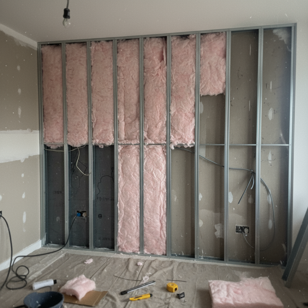 - Вариант 2. Тонкий каркас 40 мм + акустическая вата 40 мм + мембрана (типа Tecsound 70) между двумя листами (ГКЛ + ГВЛ). Толщина 60–70 мм. Дешевле, больше возни, но работает.