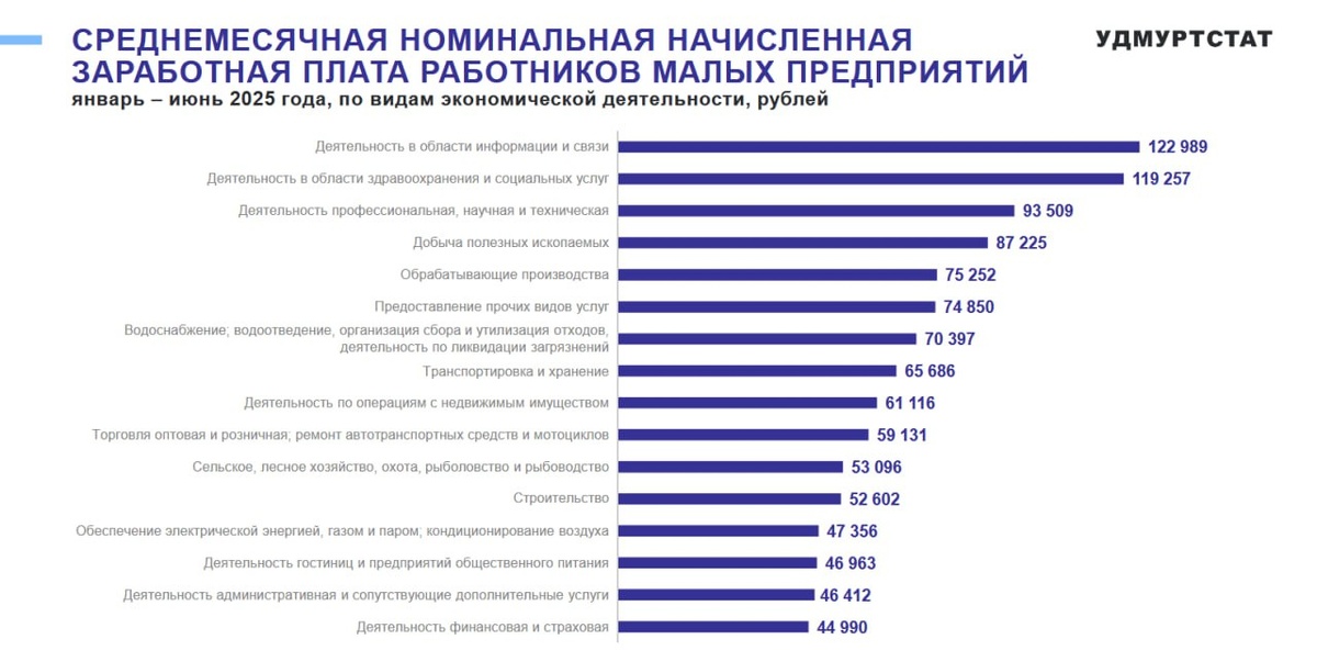 71 тыс. рублей составила средняя зарплата на малых предприятиях Удмуртии В период с января по июнь 2025 года средняя зарплата на малых предприятиях Удмуртии (менее 100 сотрудников) составила 71,2 тыс. рублей, сообщает Удмуртстат. Это на 22,1% больше, чем за аналогичный период прошлого года. Средняя зарплата сильно разнится в зависимости от вида деятельности предприятия. Если компании, работающие в Удмуртии в области информации и связи, готовы платить своим сотрудникам в среднем 122,9 тыс. рублей, то среднемесячная зарплата сотрудников компаний из сферы финансов и страхования составила 44,9 тыс. рублей. Фото: Удмуртстат Подписывайся на Ижевский бизON #Удмуртия