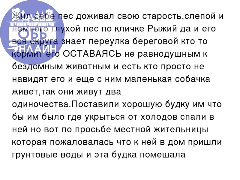 ↗ Жил себе пес доживал свою старость,слепой и немного глухой пес по кличке Рыжий да и его вся округа знает переулка береговой кто то кормит его ОСТАВАЯСЬ не равнодушным к бездомным животным и есть кто просто не навидят его и еще с ним маленькая собачка живет,так они живут два одиночества.Поставили хорошую будку им что бы им было где укрыться от холодов спали в ней но вот по просьбе местной жительницы которая пожаловалась что к ней в дом пришли грунтовые воды и эта будка помешала ей,приехали люди с администрации и сказали будку снести из за не антисанитария кругом и ее убрали куда то а то что по всему городу такая антисанитария,КРЫСЫ В ПОМОЙКАХ БЕГАЮТ !!ТАК ЭТО НОРМАЛЬНО А БЕДНЫЙ И СЛЕПОЙ ПЕС ПОМЕШАЛ ИМ,СКАЖИТЕ ЭТО ЕГО ВИНА ЧТО ЕГО БРОСИЛИ ПРЕЖНИЕ ХОЗЯЕВА И ЧТО ОН И ДОЖИВАЕТ СВОЮ СТАРОСТЬ НА УЛИЦЕ СЛЕПЫМ И ГЛУХИМ !!!ЭТУ БУДКУ ЕМУ ОТДАЛИ ЛЮДИ ДОБРЫЕ ПОМОГЛИ ПРИВЕЗТИ ЕЕ ЧТО ОН ТАМ СПАЛ В ТЕПЛЕ А НЕ НА ХОЛОДНОЙ ЗЕМЛЕ ПОД ДОЖДЕМ И СНЕГ.ВЕРНИТЕ БУДКУ НА МЕСТО И…