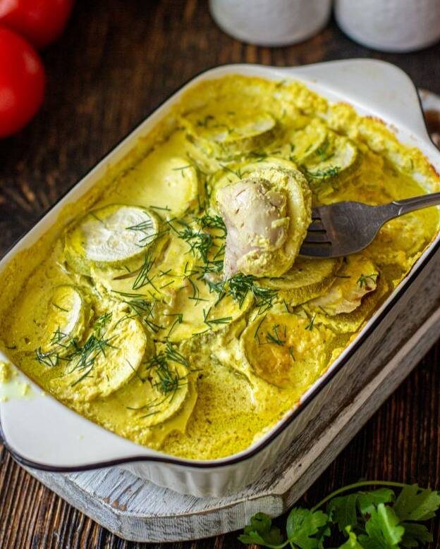 🥒 Курица с кабачками в сметанном соусе с куркумой (ПП-версия) Ингредиенты: • куриное филе – 400 г • кабачок – 2 шт. • сметана 10-15% – 3-4 ст. л. • чеснок – 1 зубчик • куркума – 0,5 ч. л. • соль, перец, зелень по вкусу Приготовление: 1. Куриное филе нарезать кусочками, кабачок кружочками. 2. Выложить слоями в форму для запекания. 3. Смешать сметану с чесноком, куркумой, солью и перцем. 4. Залить соусом курицу и кабачки. 5. Запекать при 180°С около 30-35 минут. 6. Перед подачей посыпать свежей зеленью. ✨ Получается лёгкое, питательное блюдо с красивым солнечным оттенком и нежным вкусом.