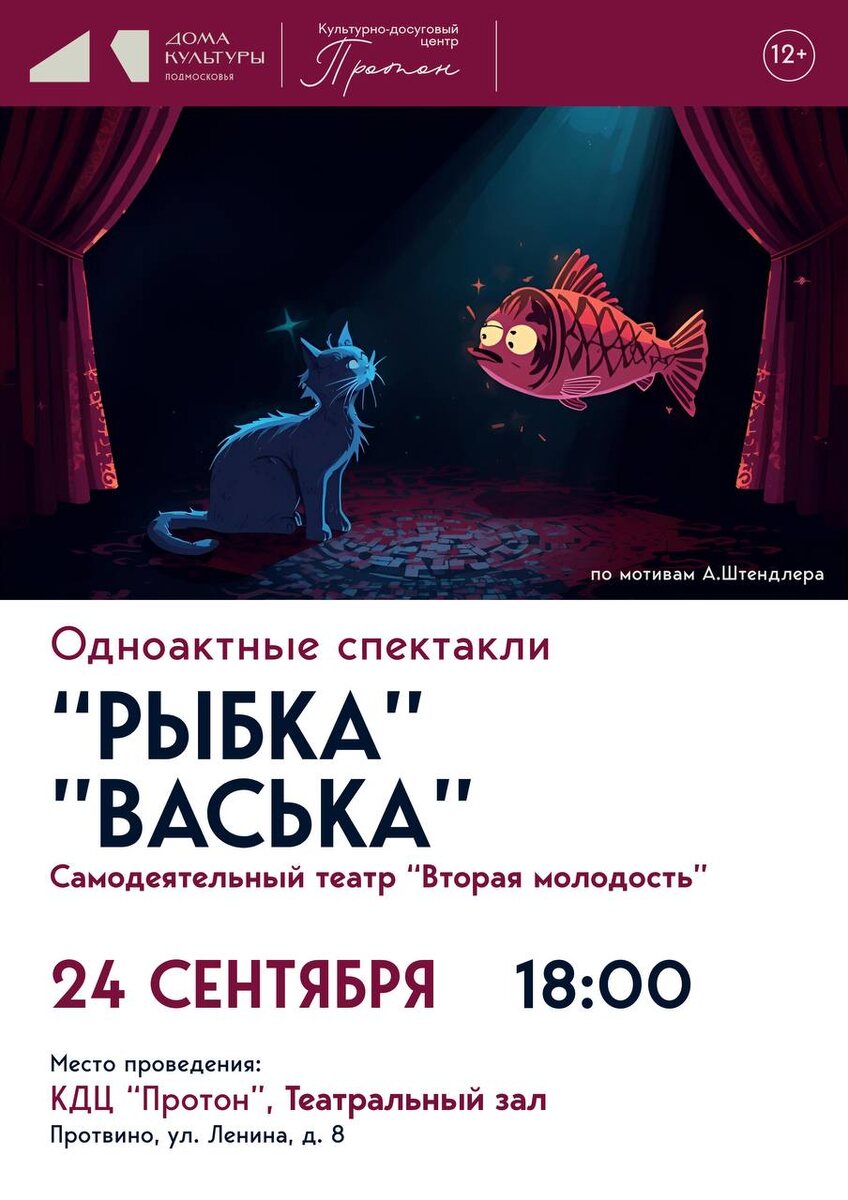 ✨ Приглашаем вас на два одноактных спектакля по мотивам пьес Александра Штендлера «Васька» и «Рыбка» Открываем театральный сезон вместе с Самодеятельным театром «Вторая молодость»! 🎭 🚫 Возраст: 12+ 📆 24.09.2025 🕒 18:00 🏢 ДК "Протон" 📍 г.о. Серпухов, г. Протвино, ул. Ленина, 8 💰 Вход свободный❗️ ⭐Поддержать канал голосом 💰 Вакансия - курьер в Серпухове ✅ Мероприятия Серпухов https://dzen.ru/id/66f01c6eb4c6fe60c9ca1608 http://vk.com/serpukhov_events http://dzen.ru/serpukhov_events