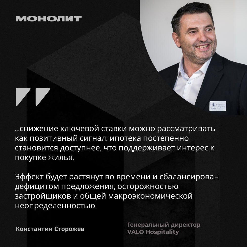 👤Снижение ставки: стало ли легче? 🗣Мнение Константина Сторожева, ген. директора VALO Hospitality, председателя экспертного совета по апарт-отелям и сервисным апартаментам Российской гильдии управляющих и девелоперов: Снижение ставки — безусловно важный шаг, однако он не решает проблему доступности жилья. Средняя ставка по рыночной ипотеке снизилась лишь до 23%, и для большинства покупателей она остается высокой. Заметный эффект на спрос возможен только при уровне 14% и ниже. В сегменте апартаментов ситуация другая: ипотека играет здесь второстепенную роль, поэтому решение ЦБ оказывает ограниченное влияние. Для инвесторов ключевыми остаются факторы стабильности, прозрачности рынка и прогнозируемой доходности на горизонте нескольких лет. Тем не менее снижение ключевой ставки можно рассматривать как позитивный сигнал: ипотека постепенно становится доступнее, что поддерживает интерес к покупке жилья. Однако рассчитывать на быстрое восстановление рынка преждевременно. Эффект будет рас
