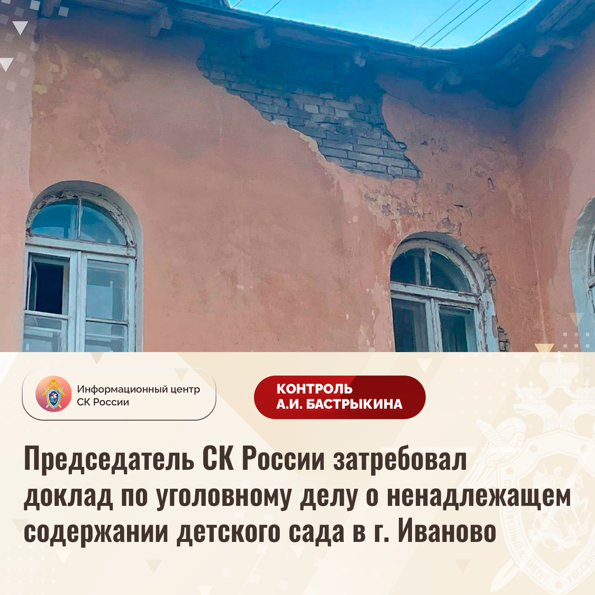 Председатель СК России затребовал доклад по уголовному делу о ненадлежащем содержании детского сада в г. Иваново В социальной сети сообщается о ненадлежащем обслуживании одного из детских садов в городе Иваново. Фасад, фундамент и входные группы здания разрушаются, элементы кровли прогнили, оконные стеклопакеты находятся в ветхом состоянии. Кроме того, в дошкольном учреждении отсутствует достаточное количество свободных мест. Несмотря на имеющиеся нарушения, мер к организации ремонтных работ не принимается. В СУ СК России по Ивановской области возбуждено уголовное дело. Председатель Следственного комитета Российской Федерации Александр Иванович Бастрыкин затребовал у руководителя СУ СК России по Ивановской области Дмитрия Аркадьевича Позовского доклад о предварительных и окончательных результатах расследования уголовного дела. Исполнение поручения поставлено на контроль в центральном аппарате ведомства. #СледственныйКомитет #СКРоссии #СКР #ИЦСКР #ИнформационныйЦентр #АлександрБастрыки