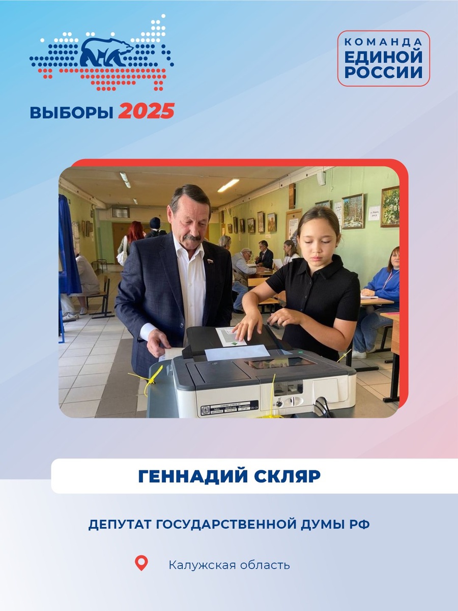 ✔️Геннадий Скляр проголосовал в Обнинске Депутат Госдумы пришел на избирательный участок с внучкой. Парламентарий проголосовал в 11-й школе Обнинска. Геннадий Скляр отметил организацию избирательного процесса: «на участке всё прекрасно организовано - безопасно, удобно и по-домашнему». «Приходите и отдайте свой голос за будущее нашего края! Найдите 10-15 минут дойти до участка и проголосовать. Дело несложное, но важное. От нашего с вами выбора зависит будущее региона. Сделаем его вместе! Каждый наш поступок, действия - это пример для наших детей и внуков. Важно показать им, что мы любим наш край и заботимся о его будущем!» - обратился к жителям Калужской области Геннадий Скляр. #ЕР40 #Выборы2025