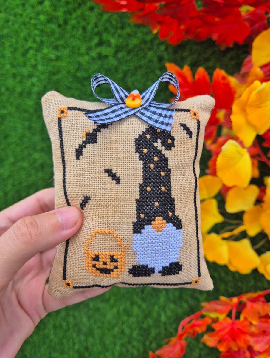 В основном я оформила в первую очередь осенние дизайны, а точнее те, что связаны с праздником Хэллоуин 31 октября. Под все дизайны закупала различные тематические пуговички в магазине Шёлковая нить. Собственно, вот такой вот маленький милый гномик получился! Пуговичка в виде маленькой конфетки, которые продаются в США на Хэллоуин.