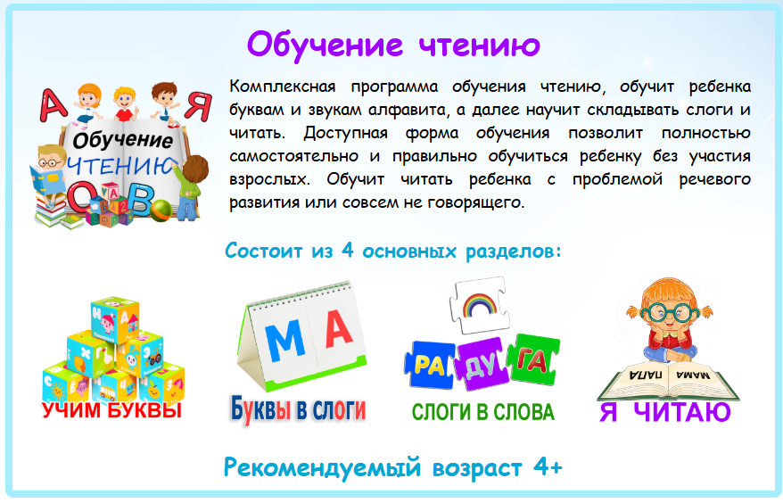 Как жаль что я не разработала раньше эту методику обучения, но замечательно что я теперь могу помогать другим. Я разработала полную комплексную программу для обучения чтению, позволяющую легко обучать детей. Мы протестировали эту методику и технологию более чем на 1000 детей, адаптировали под разные устройства (интерактивная панель, компьютер, ноутбук, планшет и даже смартфон), чтобы можно было обучать и в дошкольном учреждении так и дома. Идеальна для обучения детей с расстройством аутистического спектра , у которых проблемы с коммуникацией с педагогом. Программа в игровой форме расскажет, повторит и научит. Программа доступна после регистрации на сайте https://всёсмогу.рф Комплексная программа состоит из 4 модулей: Алгоритм программы полностью подстраивается под возможности ребенка, сохраняя прогресс прохождения, повторяя буквы и слоги столько раз сколько это необходимо индивидуально для каждого. Для неговорящего ребенка не подойдут обучения по книге, потому как невозможно определить