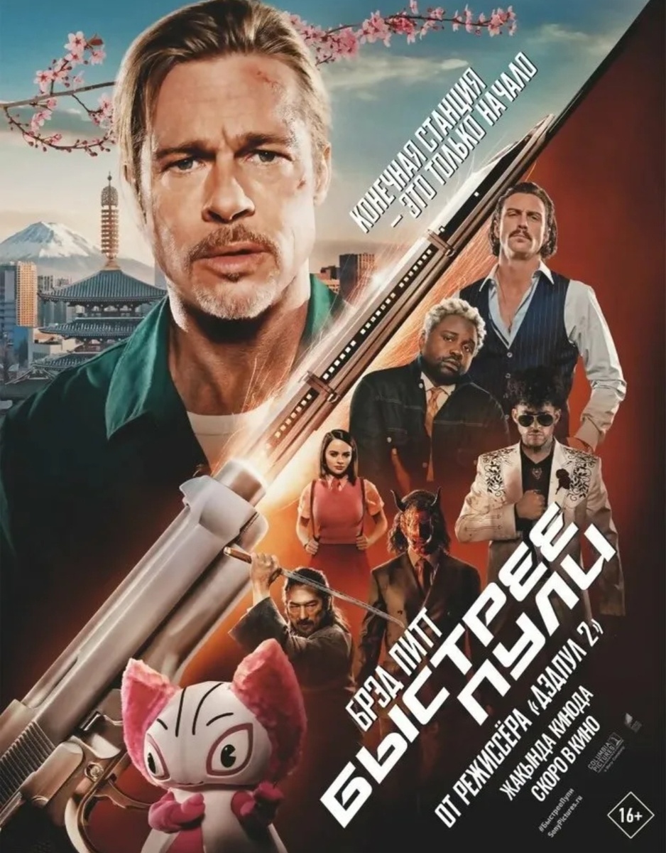 Фильм "Быстрее пули" (оригинальное название Bullet Train) вышел в 2022 году и представляет собой комедийный боевик режиссера Дэвида Лихра (David Leitch), известного зрителям по таким фильмам, как "Дэдпул 2" и "Джон Уик". Главную роль исполнил Брэд Питт (Brad Pitt). Главный герой фильма — профессиональный киллер по прозвищу "Божья коровка" (Брэд Питт), прошедший психологическое лечение и теперь стремящийся вернуться к нормальной жизни. Однако его новое задание оказывается намного сложнее обычного: ему поручено достать чемодан, находящийся в скоростном японском экспрессе, полном опасных наемных убийц. Поезд превращается в арену хаоса, поскольку каждый пассажир стремится завладеть загадочным кейсом. Среди персонажей выделяются: - Принцесса: девушка, чей отец убит одним из пассажиров поезда. - Старейшина: пожилой мужчина, имеющий собственные мотивы. - Шершень: смертельно опасная женщина-отравительница. - Лимон: сотрудник службы безопасности, оказавшийся частью конфликта. Сюжет полон н