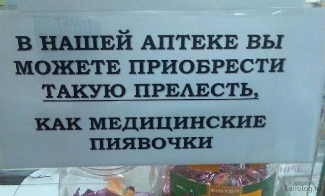 Предлагаем подборку свежих смешных анекдотов и веселых шуток про аптеку и аптекарей. Читайте свежие анекдоты, ставьте оценки, делитесь с друзьями в соц сетях. Фармацевт с 20-летним стажем, находясь на отдыхе в Иране, во время экскурсии случайно расшифровал клинопись 16 века до н. э. Парень в аптеке передо мной попросил соску, побольше размером.
