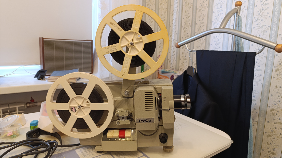 Кинопроектор "Русь" предназначен для просматривания пленки Super 8mm и Normal 8mm. Этот достался от дедушки, который увлекался видеосъёмкой. Долго не мог понять, почему не работает лампа - то ли трансформатор, то ли клавиша включения лампы, то ли патрон лампы. Проблемой оказался всего-то тумблер для переключения яркости лампы (между 12В и 6В), он просто развалился от времени. Заменил, лампа заработала.