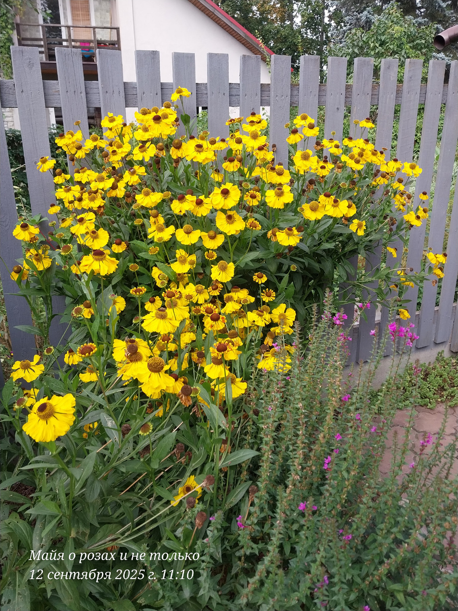 Многолетний жёлтый шарик с коричневым глазком около 40 см. В подвязке не нуждается, отлично держит форму, бывает иногда погрызен слизнями, но продолжает цветение до морозов.