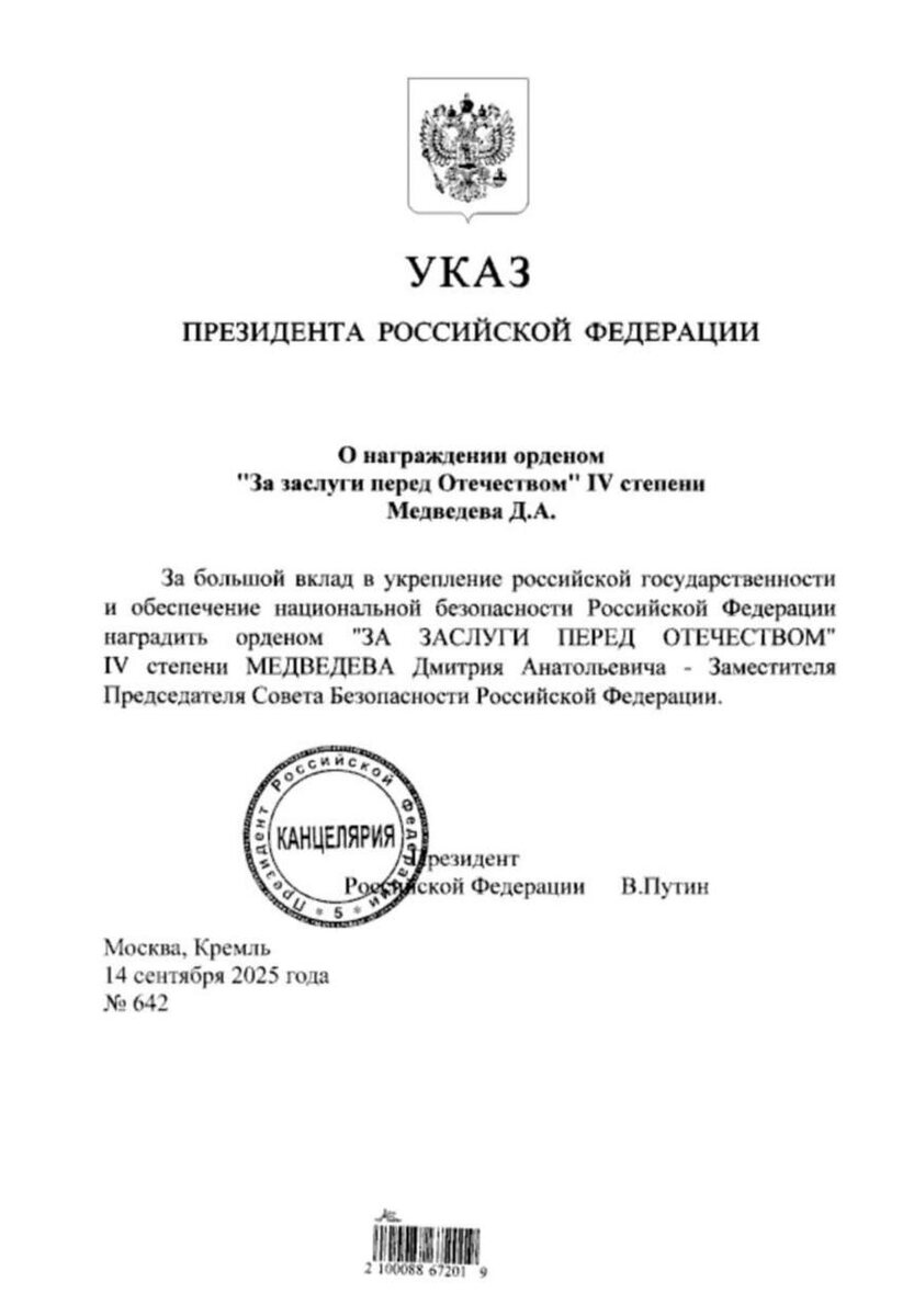 🏅 Путин наградил Дмитрия Медведева в день его 60-летия орденом "За заслуги перед Отечеством IV степени".