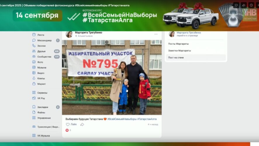 Первый автомобиль Sollers ST8 в фотоконкурсе «Всей семьёй на выборы!» выиграла Маргарита Трегубенко из Альметьевска. Победитель определён с помощью рандомайзера в эфире телемарафона. Организаторы сообщили о 26286 участниках к полудню. Кроме того, определены победители первых трех смартфонов iPhone 16: Надежда Капитонова из села Черемшана, Алсина Зарипова из Чистополя и Ляля Даминова из села Большие Кляри Камско-Устьинского района. Всего в рамках акции разыграют 11 смартфонов iPhone 16, два автомобиля Sollers ST8 и около 10 бытовых призов, включая аэрогрили и роботы-пылесосы. Для того, чтобы принять участие, с 07:00 до 20:00 сделайте семейное фото у избирательного участка с браслетом «Всей семьей на выборы» (получите его после голосования), где виден узнаваемый элемент входа – надпись или баннер. Опубликуйте в «ВКонтакте» с хэштегами #ВсейСемьейНаВыборы и #ТатарстанАлга. Полные правила – в сообществе «Татарстан Алга» в разделе «Правила фотоконкурса 14 сентября 2025». Конкурс завершится