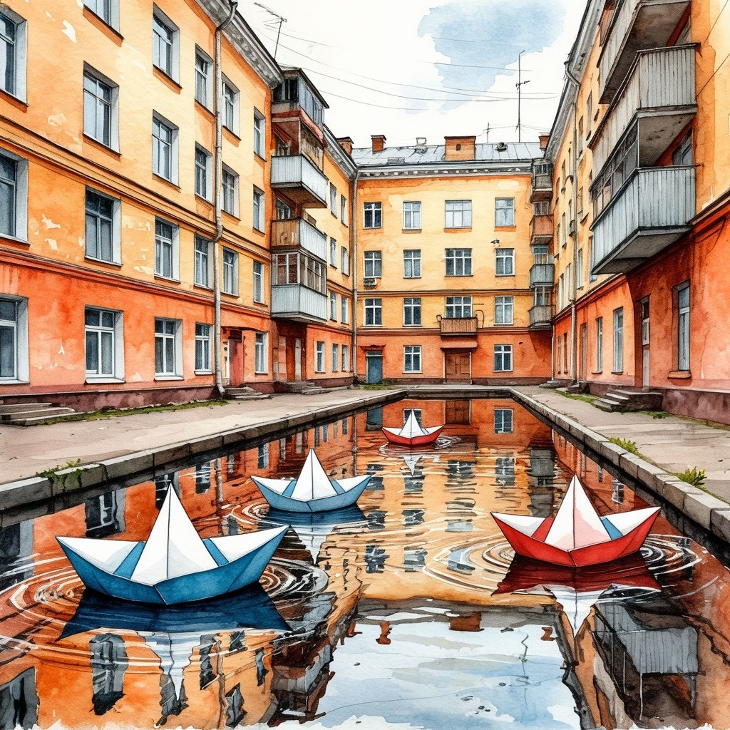 Мы выстроились на старте — на бетонном желобе, что стекал с горки у песочницы. Это был наш судостроительный плацдарм. На воду опустилась целая армада: бумажные фрегаты, пенопластовые крейсеры, кораблики из коры и один гордый «Непобедимый». Андрюха с пренебрежением швырнул свою щепку в самый центр потока.