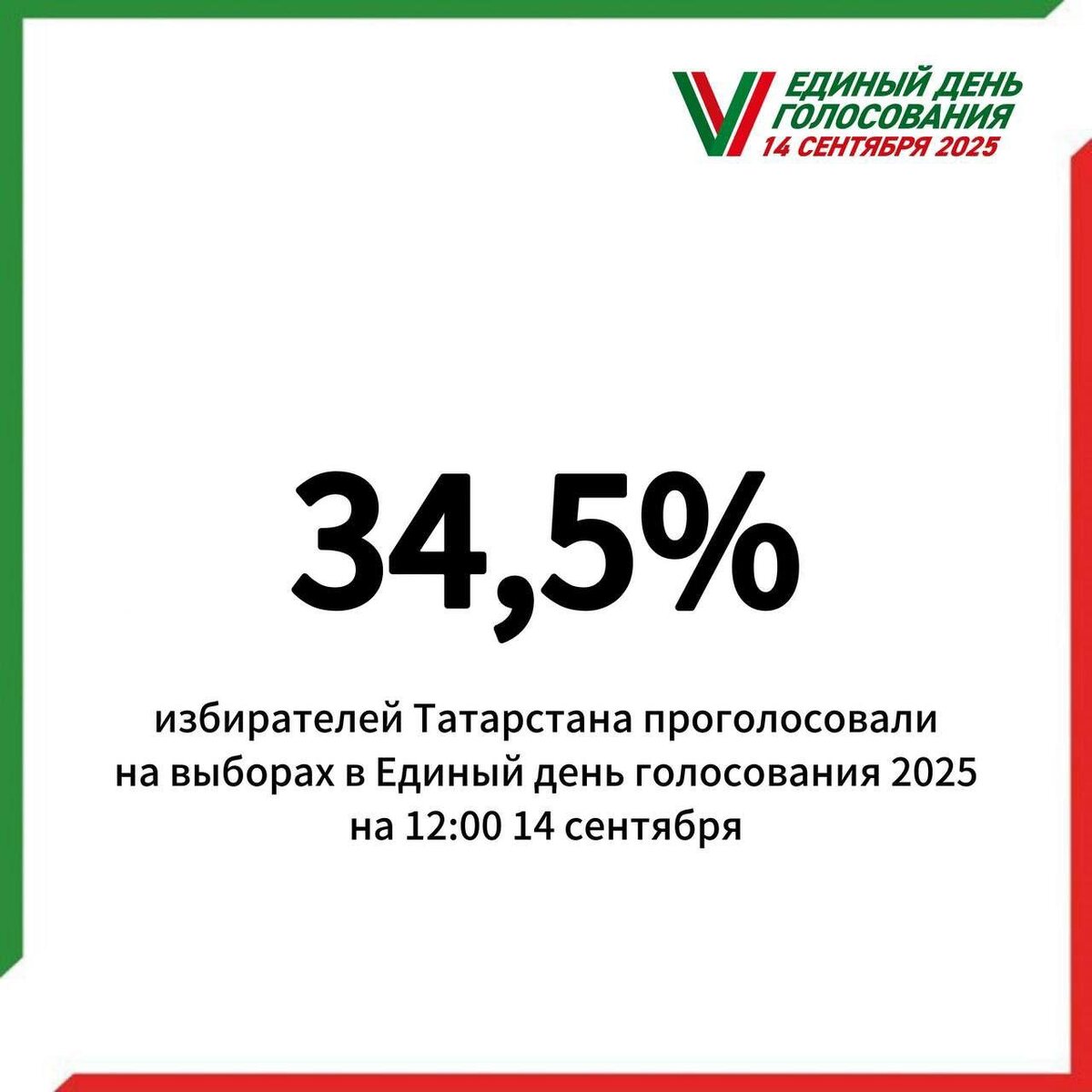 В ответ на пост На 12 часов явка на выборах в Единый день голосования 2025 составила 34,5% от общего количества избирателей республики. 🌟 Tatarstan News