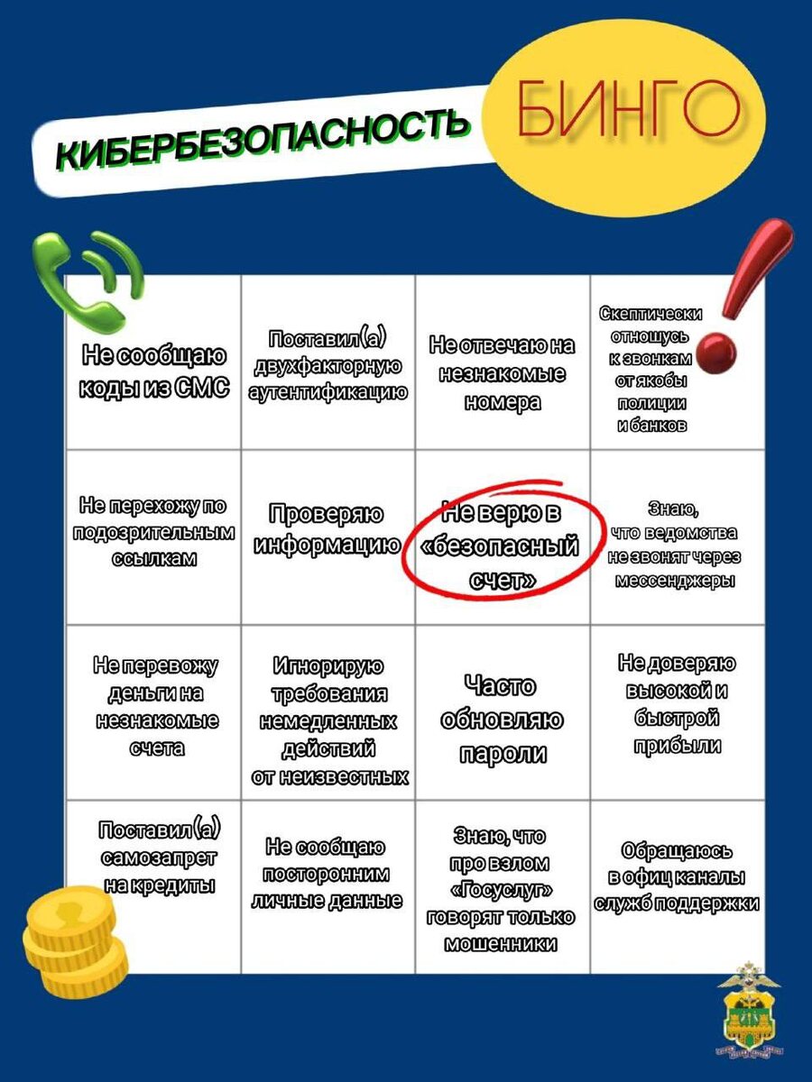 👀Как защититься от аферистов? Напоминаем обо всем, чего так «боятся» мошенники в нашем бинго по кибербезопасности ⬆️ Отмечайте пункты и узнайте, насколько вы защитили себя от обмана ✅ 🔥 – отмечено все ♥️ – осталось несколько пунктов ⚡️– буду использовать бинго! 🚨 Полиция Кубани
