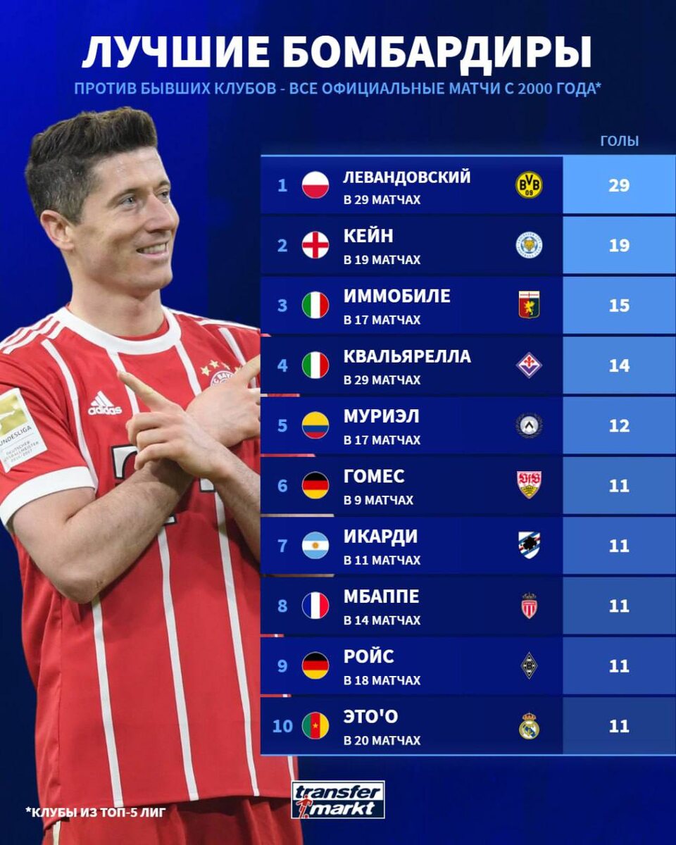 🔝Игроки из топ-5 лиг Европы, которые чаще всего забивали своим бывшим клубам (с 2000 года