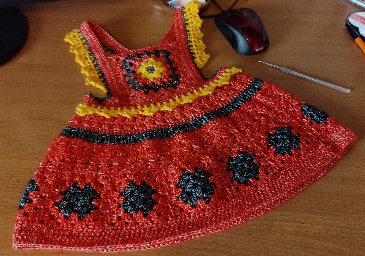 Соединяла мотивы между собой провязывая последний ряд. По низу провязала 2 ряда СС1Н (столбики с одним накидом в один приём) Далее вверх, связала 4 ряда алой нитью - 2 ряда СС1Н и 2 ряда узором БК.