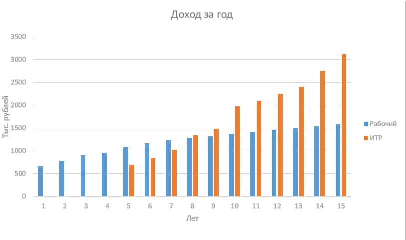 После школы стоит дилемма: быстрее начать зарабатывать или потратить 4 года на учебу в вузе. Давайте разберемся не на эмоциях, а на цифрах. Что говорит чистая математика? ➤ Считаем выгоду в рублях за 15 лет · Годы 1-4: Стабильный заработок. Итого: ~3,3 млн руб. · Годы 5-10: Зарплата растет, но упирается в потолок. Итого: ~7,47 млн руб. · Годы 11-15: Потолок зарплаты достигнут. Рост минимален. Итого: ~7,5 млн руб. · Общий заработок за 15 лет: ~18,27 млн руб. · Годы 1-4: Учеба. Доход: 0 руб. (или мизер на подработках). · Годы 5-10: Стартовая зарплата невысока, но есть потенциал роста. Итого: ~7,35 млн руб. · Годы 11-15: Карьерный рост, повышение квалификации. Итого: ~12,6 млн руб. · Общий заработок за 15 лет: ~19,95 млн руб. ➤ Что видно на цифрах? 1. ИТР обгоняет рабочего по совокупному доходу только на 10-й год своей карьеры (и на 14-й год с момента начала пути). 2. Но после этого финиша разрыв начинает стремительно расти. Доход ИТР продолжает расти, а доход рабочего выходи